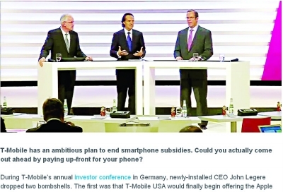 T-Mobile公司CEO John Legere(中)在投资者大会上宣布,明年全面停止手机补贴。