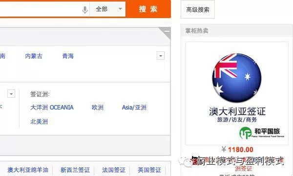 但是在淘宝上,大家使用搜索的目的就要明确得多。如果我在淘宝上搜索“澳大利亚 签证”这个关键词,我不可能是去找攻略的,一定是想花钱办签证。这种场景下,提供匹配广告的转化率会高很多。