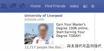 对于Facebook来说,侧边栏广告是其重要的收入来源,其基础的投放、展现和收费模式跟普通竞价广告差别不大,但是Facebook在广告中加入了各种各样的社交元素。例如上图中,广告内容下方有一行字“12,717 people like this”。一般我们会觉得,有很多人推荐过、使用过的产品或服务,肯定不会差,Facebook的Like功能结合广告,很好的抓住了人们的从众心理,拉近了受众与广告之间的距离。