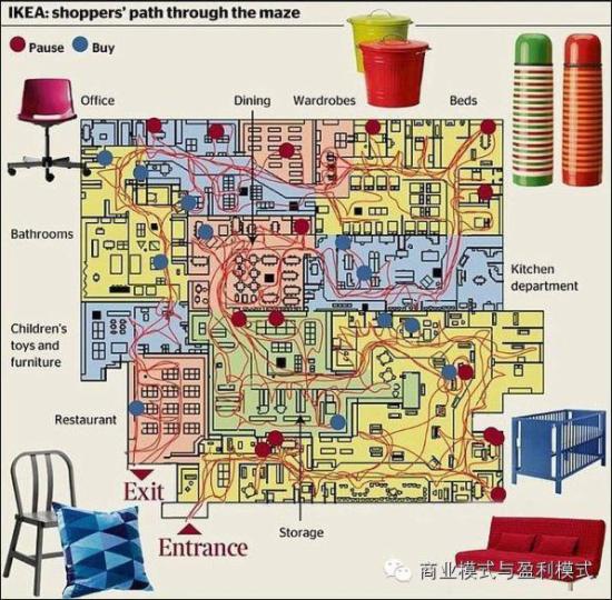 著名的家居卖场宜家,据说也曾使用过这样的策略来提高销量。所谓“自古宜家一条路”,有报道称,一旦进入宜家商场,你基本上就必须走完全程才能出来(有一些快捷通道,但是特别隐蔽)。宜家靠着“让顾客迷路”的方式来促成更多的订单,以至于“有高达60%的购买品,不在顾客原本想买的清单之内。”(后来被媒体曝光,据说做出了改变。宜家家具如何靠迷路创造60%的冲动购物)
