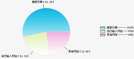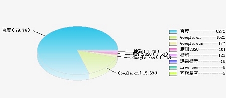 下面是我一个网站今天的搜索引擎访问量统计,百度带来8000多个网民,占到将近80%的份额。google带来了1600个网民,来自gogole访问量已经远远超出了我对google的期望值,但和百度相比较而言,差距实在太大。