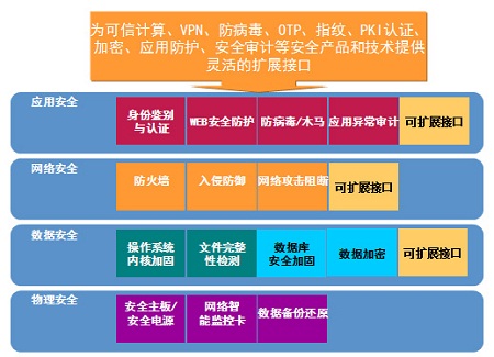 为可信计算、VPN、防病毒、OTP、指纹、PKI认证、加密、应用防护、安全审计等安全产品和技术提供灵活的扩展接口。