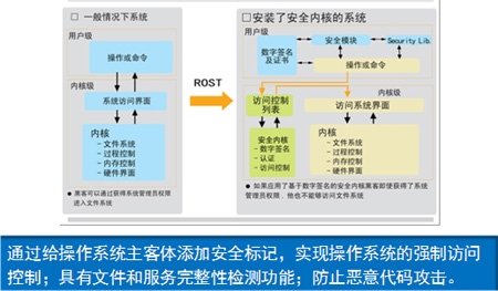 通过系统内核加固,实现对系统数据和文件的强制访问控制;通过“三权分立”原则重新划分系统帐号权限。