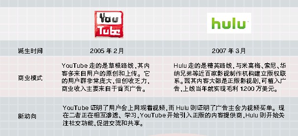 以央视网为代表的“国家队”视频网站之所以开始扎堆进场,与视频领域盈利模式日渐清晰相关。视频领域的发展一直有两种模式:视频分享和视频点播。视频分享注重于用户自创,代表企业是YouTube,国内则以土豆网为代表。但这种模式盈利较为困难,目前被土豆网王微自嘲为工业废水。另一种是视频点播,P2P网络电视也归于此类,只是使用的技术方式不同。现在,视频点播和P2P已经相互渗透,形成了视频集成点播+直播的模式,代表企业为Hulu和PPS。Hulu仅以9000部影视作品就创造了月均访问量850万人次,以高达80%的广告植入模式实现获利。而本身就拥有大量内容的央视网等企业,当然不会坐视不理。