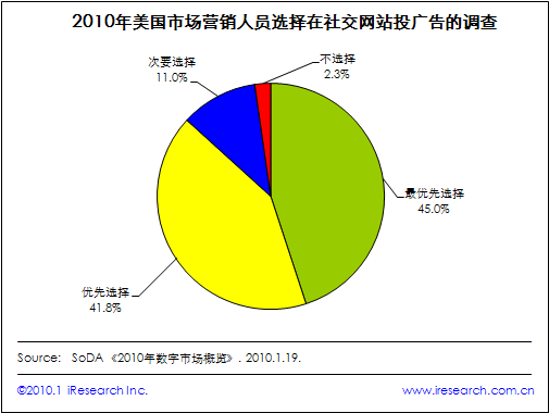2月9日消息,艾瑞咨询今日发布报告称,根据调研数据中发现,2010年有45.0%的市场营销人员将社交网站作为未来投放广告的最优先选择平台,41.8%的被调查者将它作为优先选择,11.0%为次要选择,而不选择的比例只有2.3%。