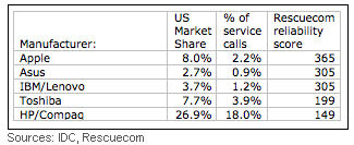 Rescuecom是按照每家电脑生产商电脑返修比例,除以IDC计算出的每家生产商美国市场份额,测定出各家厂商产品的可靠性。虽然苹果在Rescuecom 2010报告中得分最高,不过其相对第二名的领先优势从2008年的200多分下降到今年的60分。今年排名前五名的分别是苹果(365分)、华硕(305分)、IBM/联想(305分)、东芝(199分)和惠普/康柏(149分)。