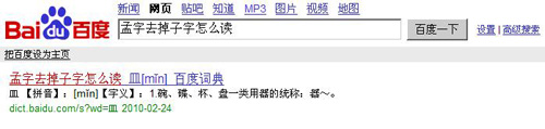 2月25日消息,百度最新的的拆字查询功能已于近日上线,网民在百度搜索框输入“孟字去掉子怎么读”等相关问题即可直接获得答案,从而让网民用最快的时间解决最专业的汉字问题。