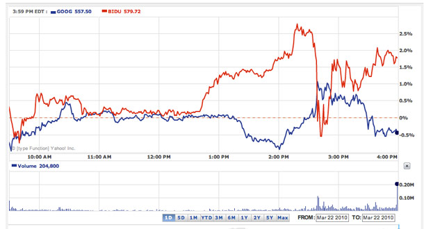 受该消息影响,百度股价周一下午大幅飙升,涨幅一度接近3%,收盘时仍增长1.75%。相比之下, 谷歌则下滑0.5%。自从谷歌宣布可能退出中国市场以来,百度股价一直呈增长态势。