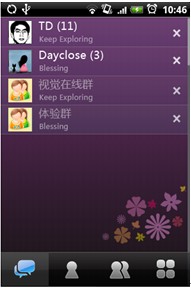 在此版本中,未读消息和已读消息用数字和文字颜色的灰度值来区分,新消息会在消息盒子里轻松显示条数,默认的紫色背景提供了最柔和的视觉效果。如果想要关掉与某个好友或群的会话,点击所在行后面的"×"按钮,就可以轻松搞定了。当你在使用手机其他功能的时候,新消息会在手机的状态栏滚动提示。