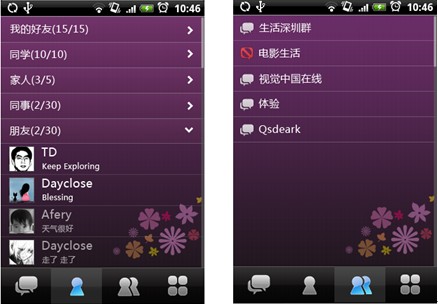 作为移动在线生活的开始,及时了解好友动态和群动态是十分必要的。AndroidQQ中可以查看所有好友的昵称和签名,还将所有的在线好友放在一个好友分组里面,让我们可以迅速找个有空的好友一起分享今天的精彩生活。