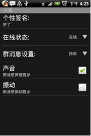 当然,AndroidQQ也支持更多的设置项:声音震动提示、在线状态和个性签名的管理,以及群屏蔽的管理,所有的设置一个界面就能搞定。