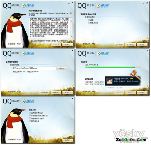 QQ概念版的安装简单,安装界面中的QQ企鹅形象图案采用了更加接近正式版企鹅的新形象,而这个新的形象也成为了QQ 概念版的新图标,贯穿于整个QQ概念版中。安装过程中没有捆绑其它软件。QQ概念版仅限于安装在Windows 7系统中,在安装过程中如果出现错误提示,请使用管理员权限运行安装程序。