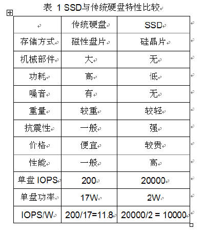 SSD硬盘用硅芯片取代了传统硬盘的马达、盘片、磁头等机械部件,具备与生俱来的绿色特性,是绿色存储系统的不二选择:1)能耗超低:传统硬盘的功耗约为7W~20W,SSD无机械部件,工作状态下典型功耗小于2W,待机功耗甚至小于0.1W。2)无突发电流:传统机械硬盘在电机启动和磁臂移动时,会产生较大的突发电流,SSD无突发电流。3)散热要求低:传统硬盘发热量大,系统需要安装高功率风扇,才能满足系统散热需求,SSD发热量极低,使用小风扇甚至自然散热就可以满足需求。4)无噪声,重量轻,抗震性好。5)超高性能:传统硬盘典型单盘IOPS为 200,SSD单盘IOPS超过20000以上。