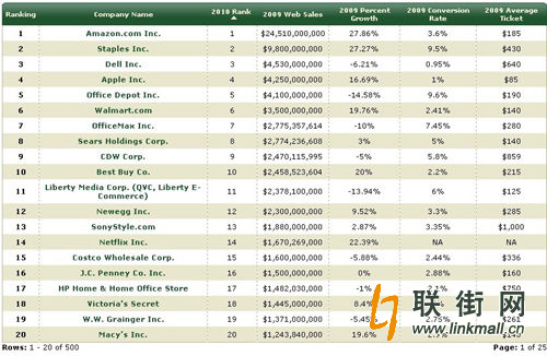 这个榜单,其实相当于美国著名电子商务研究机构InternetRetailer(以下简称IR)每年做的在线零售500强(InternetRetailerTop500Guide)的雏形,IR的榜单包括了纯粹的在线零售商(比如亚马逊、新蛋等)以及传统企业的在线销售业务(比如Bestbuy、维多利亚秘密等)。值得一提的是,即使某家企业有多条渠道——实体、互联网、呼叫中心、目录销售,IR榜单只考察其互联网零售业务的销售额以及各类运营指标。
