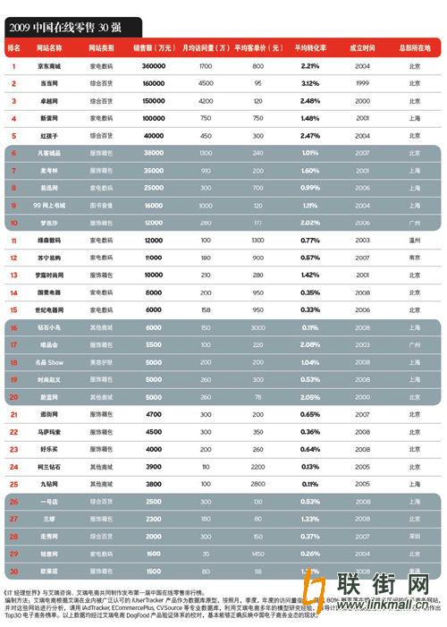 联街网研究整理:最近,《IT经理世界》和艾瑞咨询联合发布了中国在线零售30强榜单,这是中国首次发布在线零售企业的排名榜单,我们熟知的B2C企业都榜上有名,京东商城以2009年36亿元的销售额名列榜首,其次是当当网、卓越网、新蛋网、红孩子、凡客诚品占据了前5强的位置。