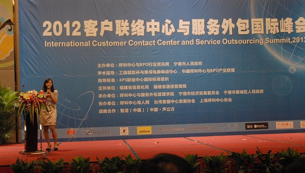 2012年度客户联络中心与服务外包国际峰会近日在福建宁德举行。该活动由呼叫中心与BPO行业资讯网主办,工信部软件与集成电路促进中心、中国呼叫中心与BPO产业联盟(CNCBA)指导,4PS联络中心国际标准作为指导标准。工信部相关领导、福建省副省长陈容凯、福建省人大常委会副主任袁锦贵、中共宁德市市委书记廖小军、宁德市市长郑新聪、4PS标准/CNCBA主席颜晓滨、4PS标准指导委员会副主席张思宏、国家人力资源与社会保障部劳动科学研究院副院长王竞、大地保险总裁郭敏及来自世界500强与著名企业的数百位嘉宾代表出席了相应活动与典礼,中国电信集团客服部副总经理黄智勇专门现场宣读了中国电信集团为国际峰会、颁奖典礼及4PS呼叫中心标准应用发来的贺电,中央电视台特别对此次活动进行了新闻报道。以下是智造中国总裁助理佟静波女士主题为《中国呼叫中心产业案例分享—中国声立方》的发言发言: