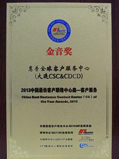 2013中国最佳客户联络中心颁奖典礼与服务外包国际峰会于2013年09月26-27日在辽宁锦州隆重举行, 300名各企业管理层代表参会。在09月26日晚上2013中国最佳客户联络中心与CRM颁奖典礼即晚宴上发布了各大奖项的获奖名单,本次评选经过严格、科学、细致的调研和评测,惠普全球客户服务中心(大连CSC&CDCD)再度蝉联“中国最佳客户联络中心-客户服务奖”的奖项。自2008年开始,惠普全球客户服务中心(大连CSC&CDCD)已连续第六年获此殊荣。