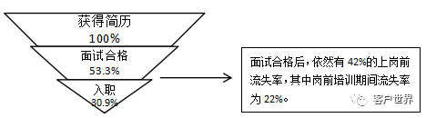 根据调研,岗前培训期间的员工流失具有行业特点和难点。下图的招聘漏斗图表示,与一般企业有较明显不同的是,即使面试合格,在上岗前由于岗前培训依然会有42%的准员工流失,造成漏斗收窄,影响招聘效率。