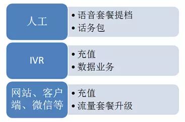 通过方案的布放试点和后期的数据统计,我们发现了客户的一些属性,例如语音套餐提档和话务包,客户会选择通过热线人工直接办理;流量套餐升级客户更接受通过短信登记或办理;数据业务(阅读包等)通过IVR登记再由人工开通;充值优惠则倾向于网站、IVR、微信等电子渠道。