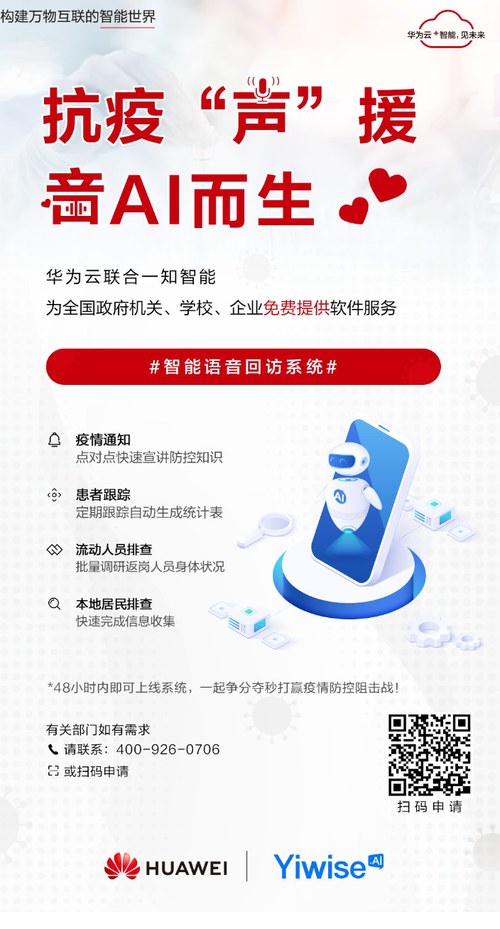 面对本次防控新型冠状病毒严峻挑战,一知智能联合华为云从即日起,免费向全国各地政府机关、学校、企业等相关疫情防控机构提供智能语音疫情回访系统,协助完成疫情的重点人群筛查、防控和宣教工作。
