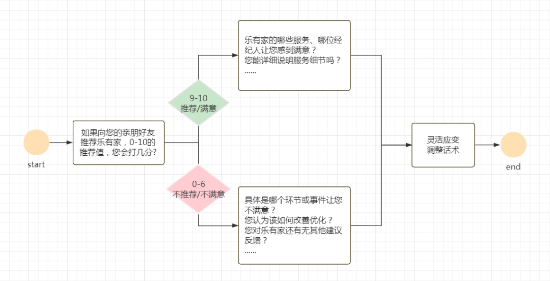 2.设置好调查问题。乐有家目前主要采用电话问询的方式,为了把握住每次和顾客近距离交流的机会,提前设置好调查问题也是十分重要的。除了上述所说的经典调查问题“如果向您的亲朋好友推荐乐有家,0-10的推荐值您会打几分”之外,我们还会根据顾客的反应进一步挖掘和增加更多的问题。