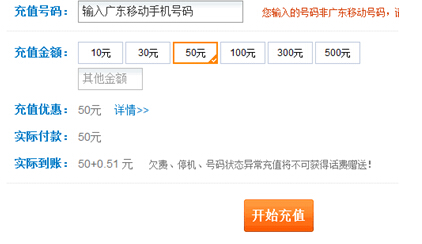 针对“没有想充的面值”这一体验问题,不仅拘泥于解决客户要充的面值,同时分析客户使用习惯,客户出于充值继续使用、延续卡的有效期等原因,又兼之消费能力的不同,主要使用的充值面额为“10元、30元、50元、100元、300元、500元”等6种额度,其中50元、100元的充值比例最高,选择这两个充值面额的客户超过50%。故将充值详情页默认充值金额定为50元。网站首页的默认金额定为100元。