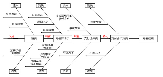 使用鱼骨图法分析现状,根据在线充值业务全流程,研究每个步骤和页面,通过数据导出和外呼调研,分析客户可能流失的原因。