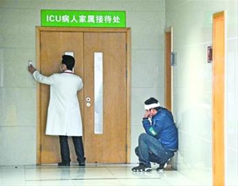 一名伤者在重症监护室门口等待亲友音讯