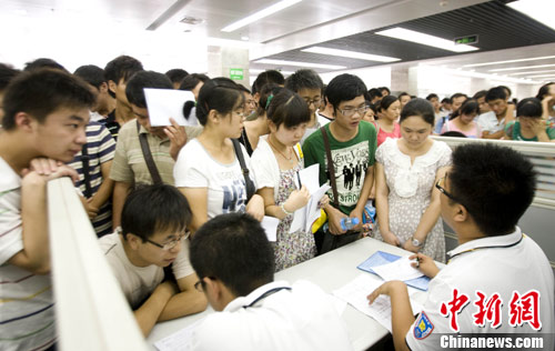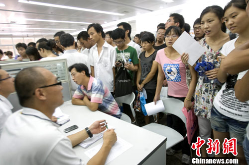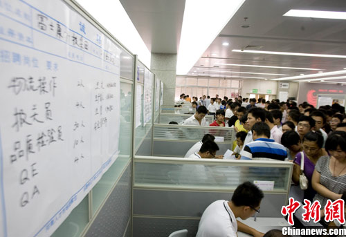 8月5日,河南郑州,设在河南省人才交流中心051、052号展位的富士康招聘现场人头攒动、水泄不通。当日,富士康在郑州举行招聘会。中新社发 王中举 摄