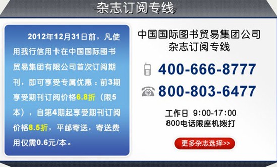 2008年,公司与法国期刊订阅公司合作,启动期刊订阅合作项目,面向中国读者提供畅销期刊订阅服务,开创了一个全新的期刊营销推广模式。通过与银行等大型金融机构合作,为其信用卡持卡人提供图书、期刊的订购服务,加强客户对银行卡的忠诚度,并且通过客户的购买行为进行客户数据分析。
