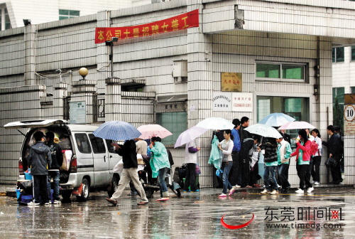 昨日傍晚,记者冒雨来到位于厚街北环路的昆盈电脑制品有限公司。有三辆包车依次停靠在厂门口,车里坐满了年轻人,脸上的无奈可以看出,他们的找工之路并不顺畅。