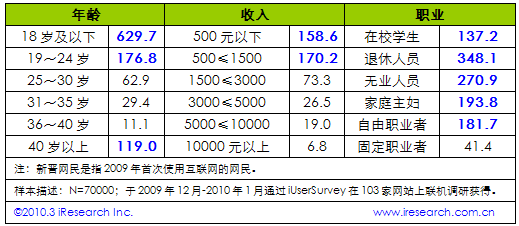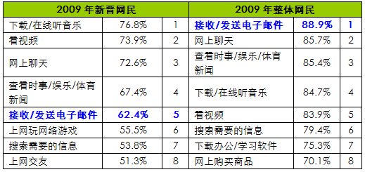 基于iResearch于2009年底在103家网站上的联机调研数据,艾瑞咨询对比新晋网民(指2009年首次使用互联网的网民)与全体网民属性后发现,新晋网民呈现一定的特征:年龄上集中于24岁以下(中青少年)和40岁以上(老年人),收入上集中于1500元以下(低收入)、职业表现不固定。另外艾瑞深入考察这部分人群的互联网应用发现,电子邮件应用占比62.4%,排名第五,而在整体网民中电子邮件应用居占比接近90%,居于首位。