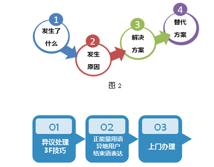 通过上面的技巧套路总结出“万能话术模板”,便于学员在实际工作情景中灵活套用。 下面举两个模板化的例子,图2为当客户抛出问题后客服人员如何接招并处理的技巧套路,图3为当客户提出异议或是投诉抱怨时客服人员如何处理的技巧套路。掌握了简单的套路后可以将其运用在相同场景的不同问题的处理中,当客服人员遇到类似问题时就能够很顺畅地处理完成客户问题。