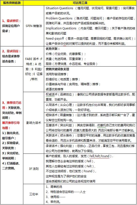 针对客户服务工作中可能出现的沟通问题、客服异议等,通过情景对话展现问题解决之道,将这些技巧套路化,使学员从中学到沟通的技能,掌握解决问题的方法。在客户服务和营销沟通中常用的套路化技巧有SPIN销售法、FABE话术、影响力话术、3F法则、三句半等(如表1)。