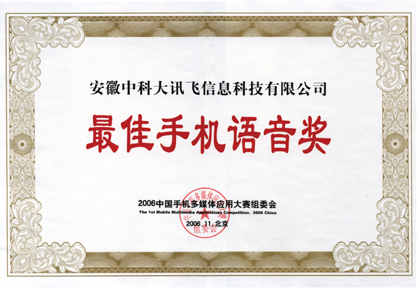 近日,首届中国手机多媒体应用大赛组委会将“2006最佳手机语音奖”这份沉甸甸的奖牌和证书授予了科大讯飞。这一由数十位业界专家和百万手机用户慎重评选出的奖项,充分说明了科大讯飞在手机语音应用领域的领先地位,其分量不言而喻。