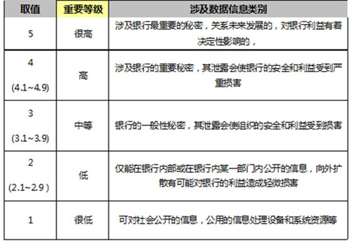 如要对客户数据进行管理,首先需将客户数据进行风险等级及人员访问权限划分。目前交通银行信用卡涉及的客户数据一般按照CIA标准进行资产等级重要性划分,即Confidentiality(保密性)、Integrity(完整性)和Availability(可用性),并按照客户资产信息等级进行1~5取值划分,即5分为最高等级,1分为最低等级(如表2)。