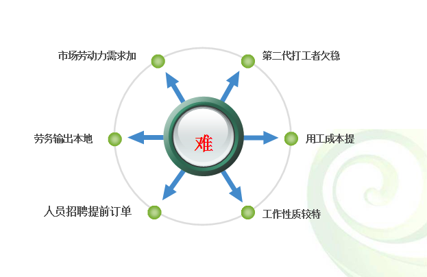 随着我国“人口红利”渐渐消失,用工问题成为许多企业的头等难题,尤其对于劳动密集型企业,开始出现招聘困难。从2009年8月以来,在珠三角、长三角等地很多企业订单增加,却招不到足够的工人,到2011年,劳动力短缺现象不但没有缓和,反而愈演愈烈,并在更大范围内由沿海地区蔓延到内陆省份,形成了不断扩大的“缺工潮”和“用工荒”。