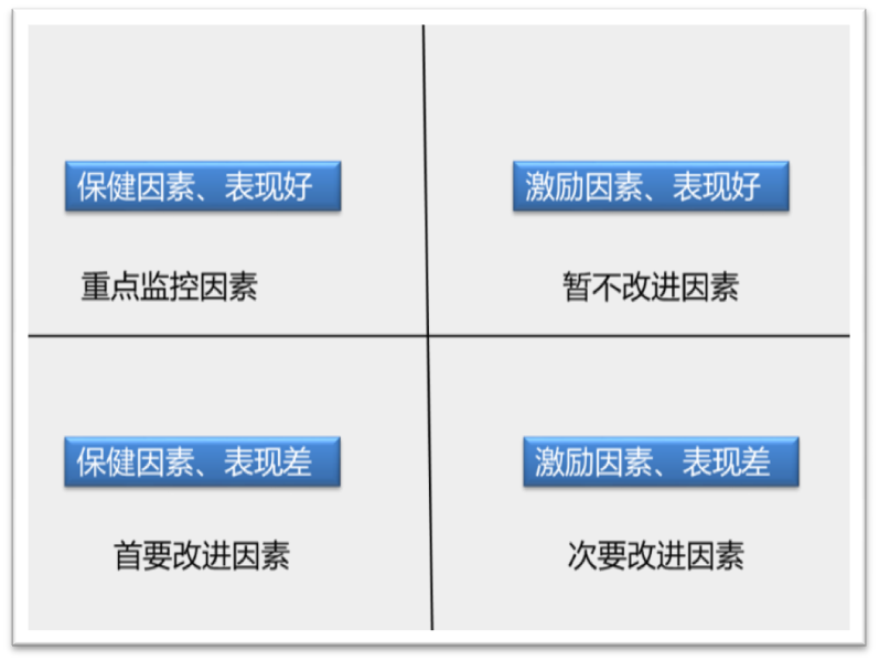 在因素识别后,可应用IPA(Importance-Performance Analysis)分析法,将影响满意度因素分成四个象限确定资源投入和改善排序。保健因素且表现较差的因素,是首要改进因素,应该优先投入资源和精力进行改进;激励因素且表现较差的因素,属于次要改进因素,在保证首要因素改善的情况下,考虑投入资源进行次要因素的改进;表现较好的保健因素属于暂不考虑改进,但需要重点监控的因素,以防止客户满意度波动及持续保持满意度优势;表现较好的激励因素属于不考虑改进因素,无需将过多的精力投入其中。