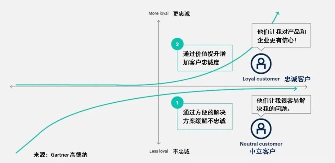 那么,什么才是提升客户忠诚度的钥匙呢?当客户产品出现故障时,客户可能会十分恼火,问题和损失已经出现,排除故障的服务活动只能让客户平息不满,却不能增加客户忠诚度;方便客户的解决方案能够避免客户的流失(图1),而通过价值提升让客户用好产品,赚到钱,才能增加客户忠诚度(图2)。换句话说,仅仅关注客户的需求体验还远远不够,企业在服务中还必须关注方便体验和价值体验,才能打开客户忠诚度的大门。