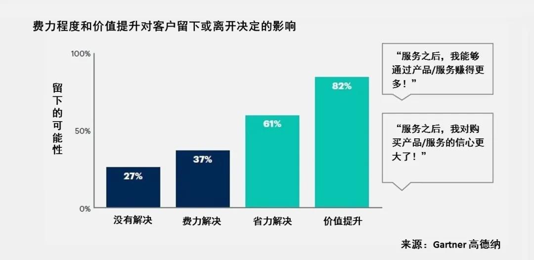 笔者认为,很多企业的管理者对服务的认识出现了偏差,他们认为满足客户需求就是服务的全部内涵,其实不然。客户产品出现故障,企业派人去排除故障,这只是表层的需求体验,满足需求体验并不足以提升客户忠诚度。更好的服务是创造方便体验,让客户处处感觉省力和方便,就能够避免客户的流失,让他们愿意跟企业打交道。最高层次的客户体验是价值体验,帮助客户用好产品和服务,给他们带来价值,得到收益,让他们坚信选择这个品牌是正确的,这就能产生客户忠诚度。