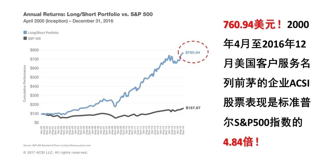 我们必须认识到,服务收入的含金量比产品销售更高,因为服务的利润率约为产品的3倍以上,服务与客户交往的机会是营销的4倍,对提升客户忠诚度更是意义深远,所以优质服务让无形资产增值的潜力是产品销售的4倍以上,能够提升客户资源的价值,2000年4月至2016年12月美国客户服务领先企业ACSI的股票表现是标准普尔500指数约5倍!(图6),就证明了服务在提升企业无形资产的长期价值。当然,糟糕的服务也会让企业的无形资产贬值。