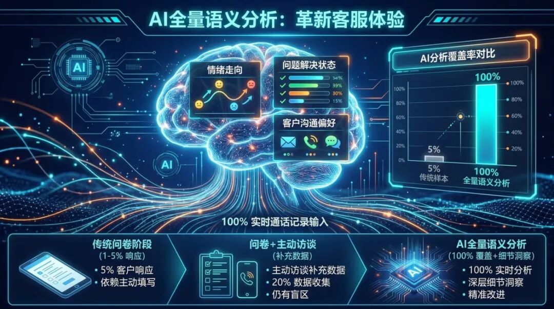 这个问题在行业里已经有了更激进的应对方向。部分企业开始用AI对通话记录进行全量语义分析,把情绪走向、问题解决状态、客户沟通偏好直接从对话文本里提取出来,绕过问卷这个中间环节。