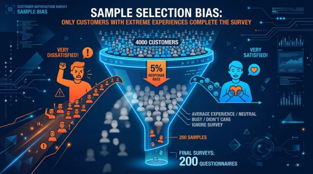 更关键的是,这200个填了问卷的人不是随机的。填问卷需要动机——有强烈情绪的客户更有动机,无论是被气到了,还是被感动了。对这次服务"还行,没什么特别感觉"的客户,绝大多数不会停下来专门打开一张问卷。这意味着调查数据系统性地过滤掉了"普通体验",而普通体验恰恰占了日常服务的大多数。
