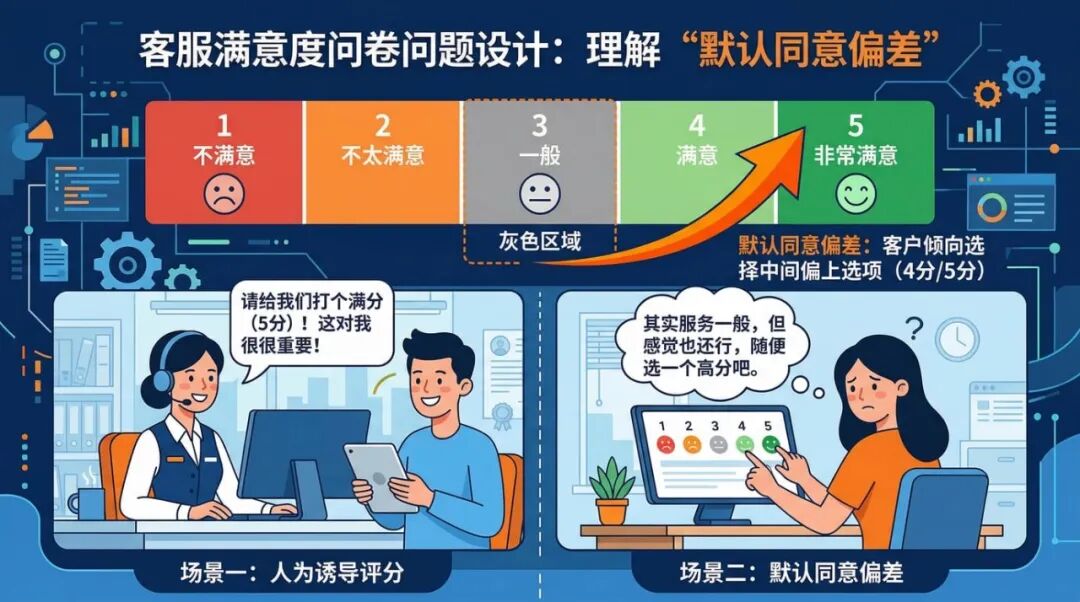 "请问您对本次服务的满意程度是?"这个问题的结构有一个隐患,心理学上叫"默认同意偏差"。当客户面对五级量表,而对这次通话没有特别强烈的感受时,他更倾向于选择中间偏上的选项——不是因为真的满意,而是选这个阻力最小,可以快速结束这件事继续干别的。