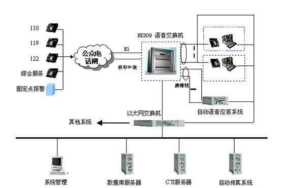 该系统主要分为电信子系统(完成联动中心与各电信公司之间话音的传输、交换和分配,以及主叫号码和主叫地址的自动查询和传输等)、接警中心子系统(统一接听和处理市民的报警、求助电话)、指挥调度子系统(或称为处警中心,通过直观的地理信息系统和数据库,可以对所有的资源和警力分布了如指掌。通过一体化的无线数据传输和无线调度台进行方便的统一管理,指挥和调度)、信息网络子系统(联动中心的骨干网络,把各种数据数库、接处警席位、移动的警用车载计算机等互联在一起,形成一个强大的信息网络)、无线指挥调度通信子系统、大屏幕显示子系统、地理信息子系统、GPS/GIS子系统。