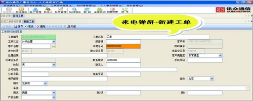 通过讯众400电话的语音智能系统,来电将按特定规则转接至坐席人员,同时客户端自动弹出待补充的工单,显示工单编号、客户编号、来电号码、来电时间、来电地区、接听员编号等基础信息,提醒坐席人员记录客户的详细信息,填写完成后点击“保存”,录入呼叫中心数据库。