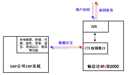 通过集成,不但可以实现与SAP公司ERP系统的实时数据传输,实现客户管理、日常办公,并且可使ERP系统上具有:点击外呼、批量外呼、来电弹屏、收听录音、查看报表、监控电话线路等更多增值功能,详细接口内容见《MVB2000 WEB开发接口》。