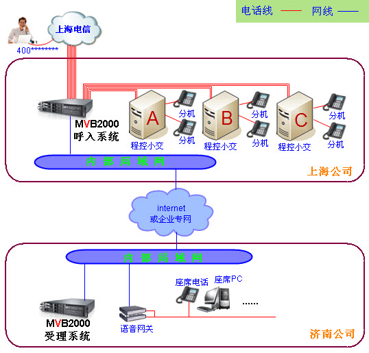 2、上海原有程控交换机下的分机通过拨打内部接入号码(即原有程控交换机下的分机线路号码),进入上海呼叫中心接入系统,通过语音导航后输入济南座席号码,然后通过IP网络传送到济南呼叫中心受理系统后拨通对应座席号码;