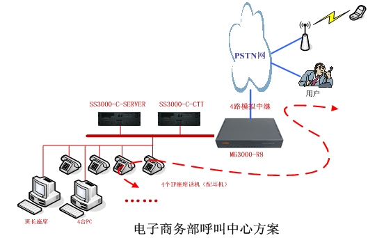 一期规模目标为4条PSTN外线接入,提供4线IVR,4个普通座席,1个班长座席;