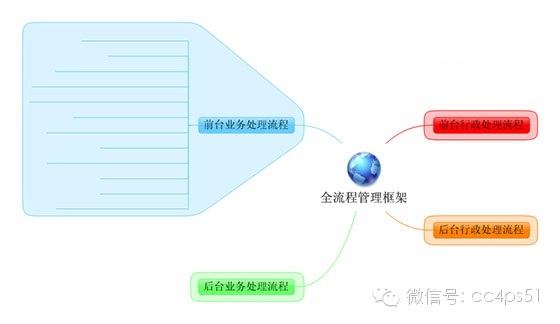 在以上研究和实践基础上,通过思维导图的引进,中心可将将现行的流程分为前台业务处理流程、后台业务处理流程、前台行政处理流程、后台行政处理流程四大类。如下图所示: